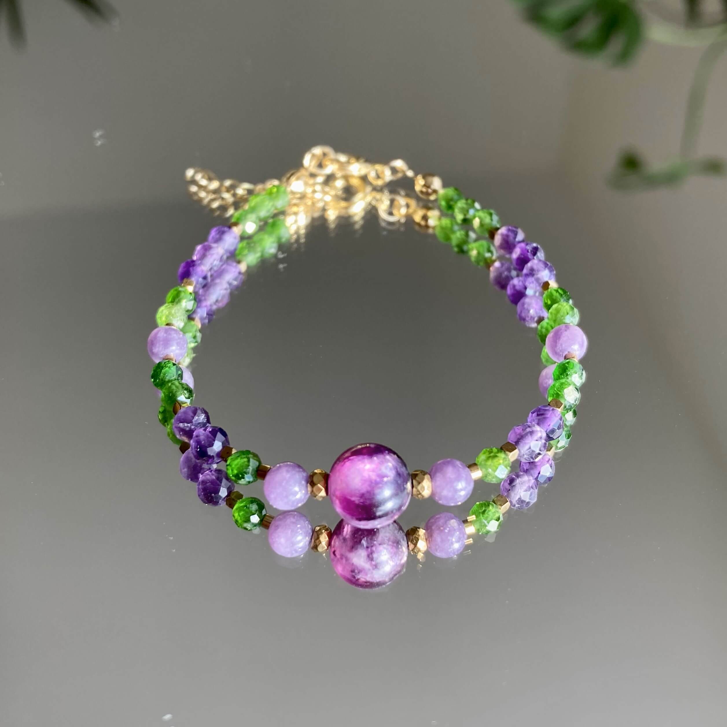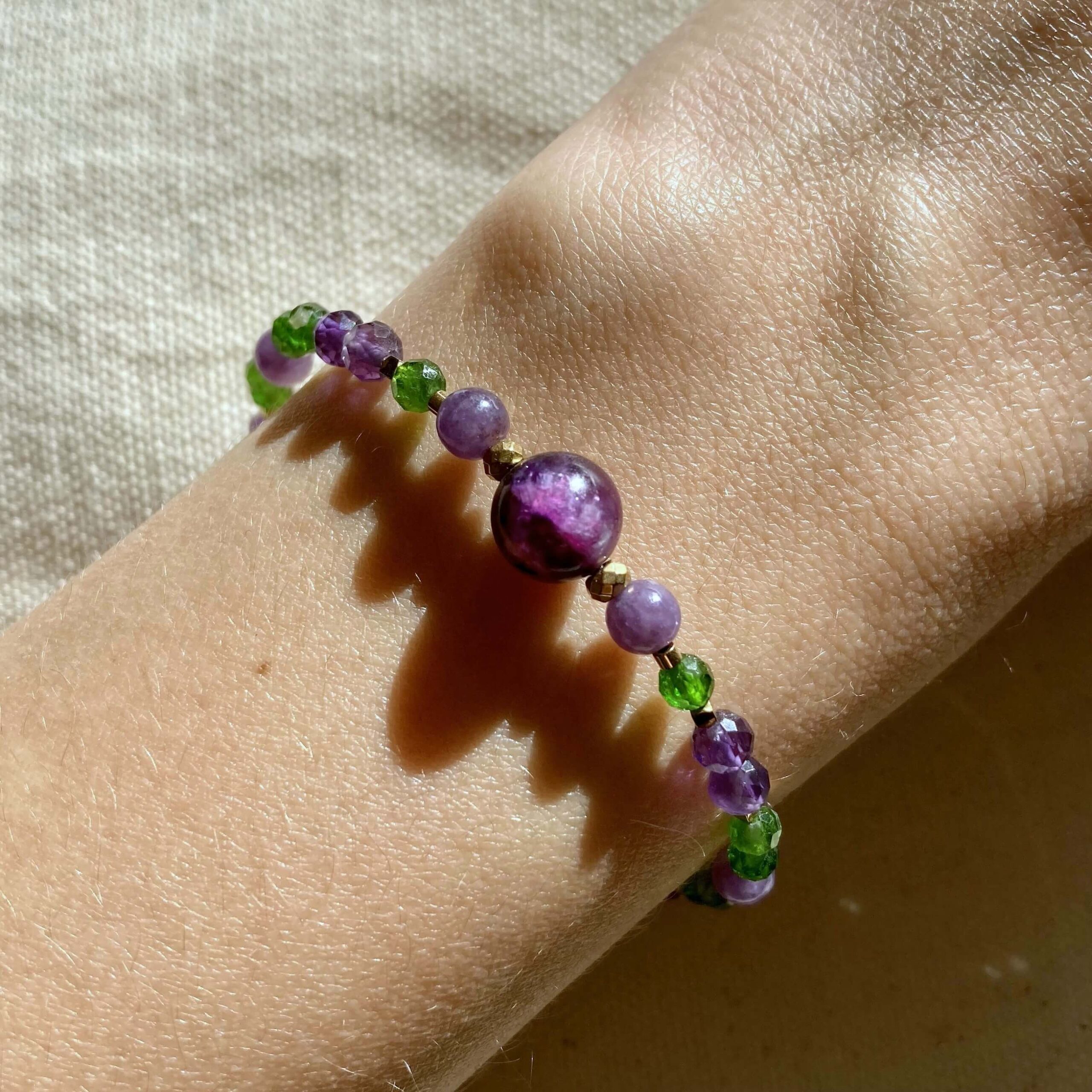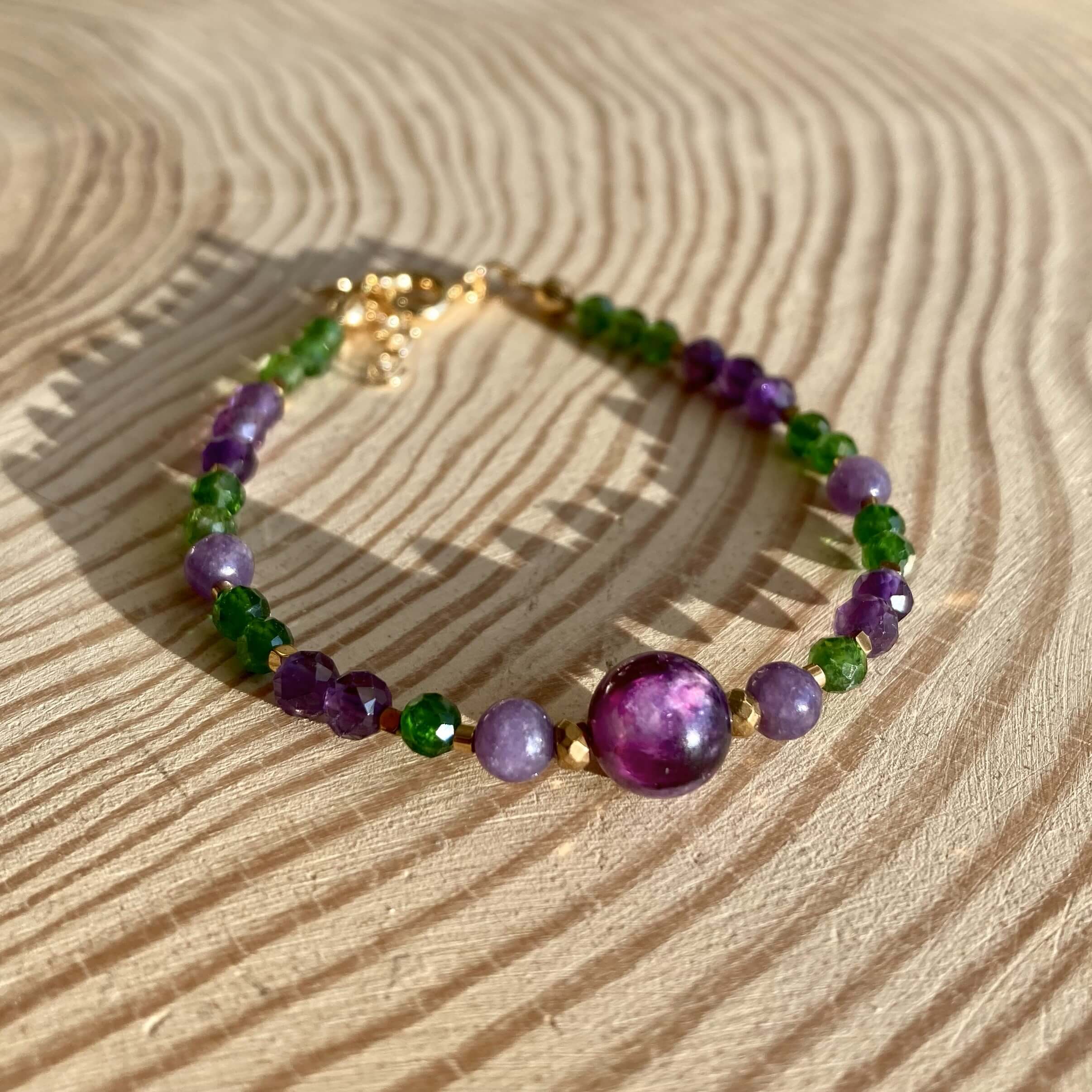 Bransoletka jest ręcznie robiona, powstała w pojedynczym, unikatowym egzemplarzu. Wykonana z naturalnych kamieni, tanzanitu, ametystu i diopsydu chromowego. Kamienie są fasetowane, co znaczy, że mają specjalny szlif dzięki, któremu pięknie odbijają światło. Bransoletka daje świetlisty i migoczący efekt.