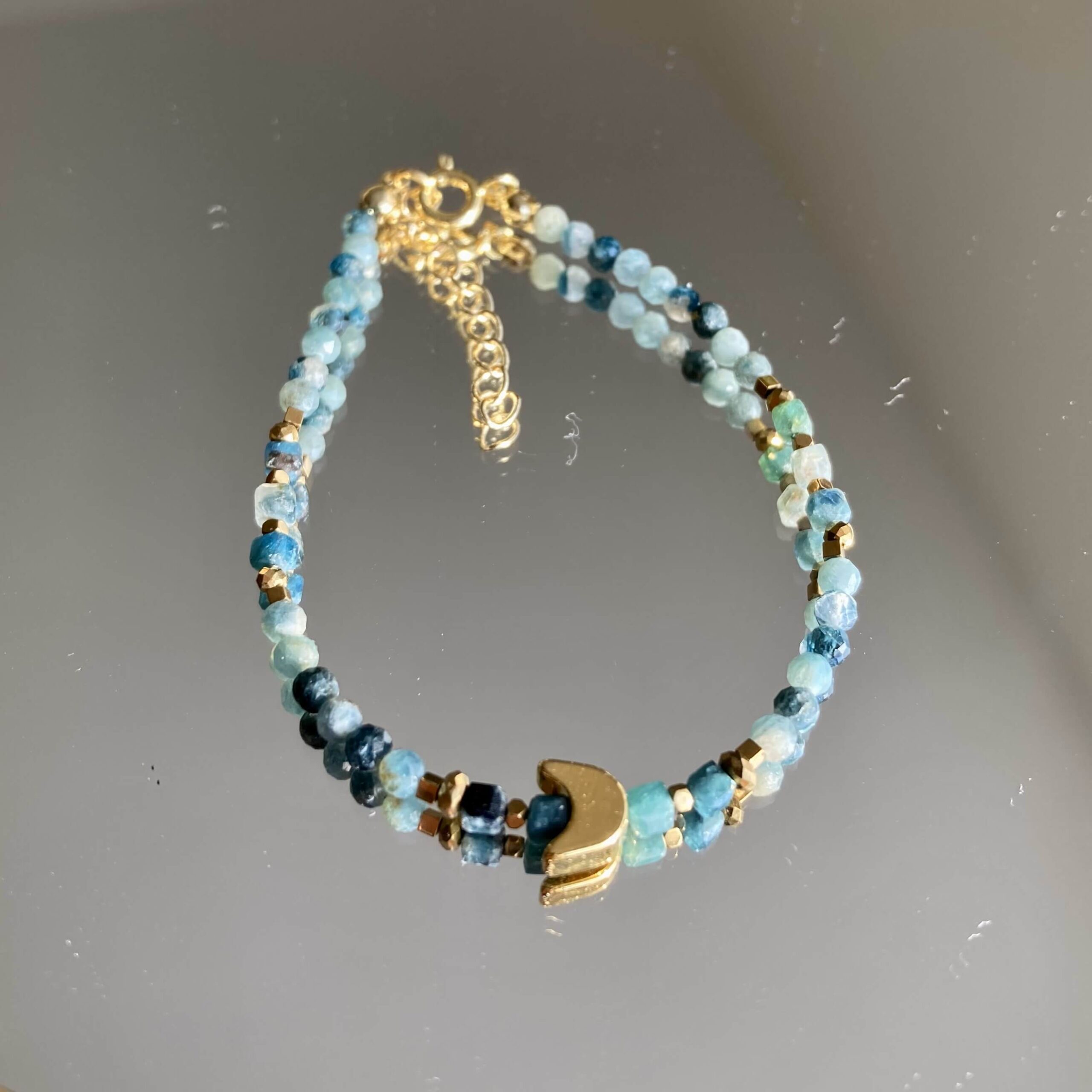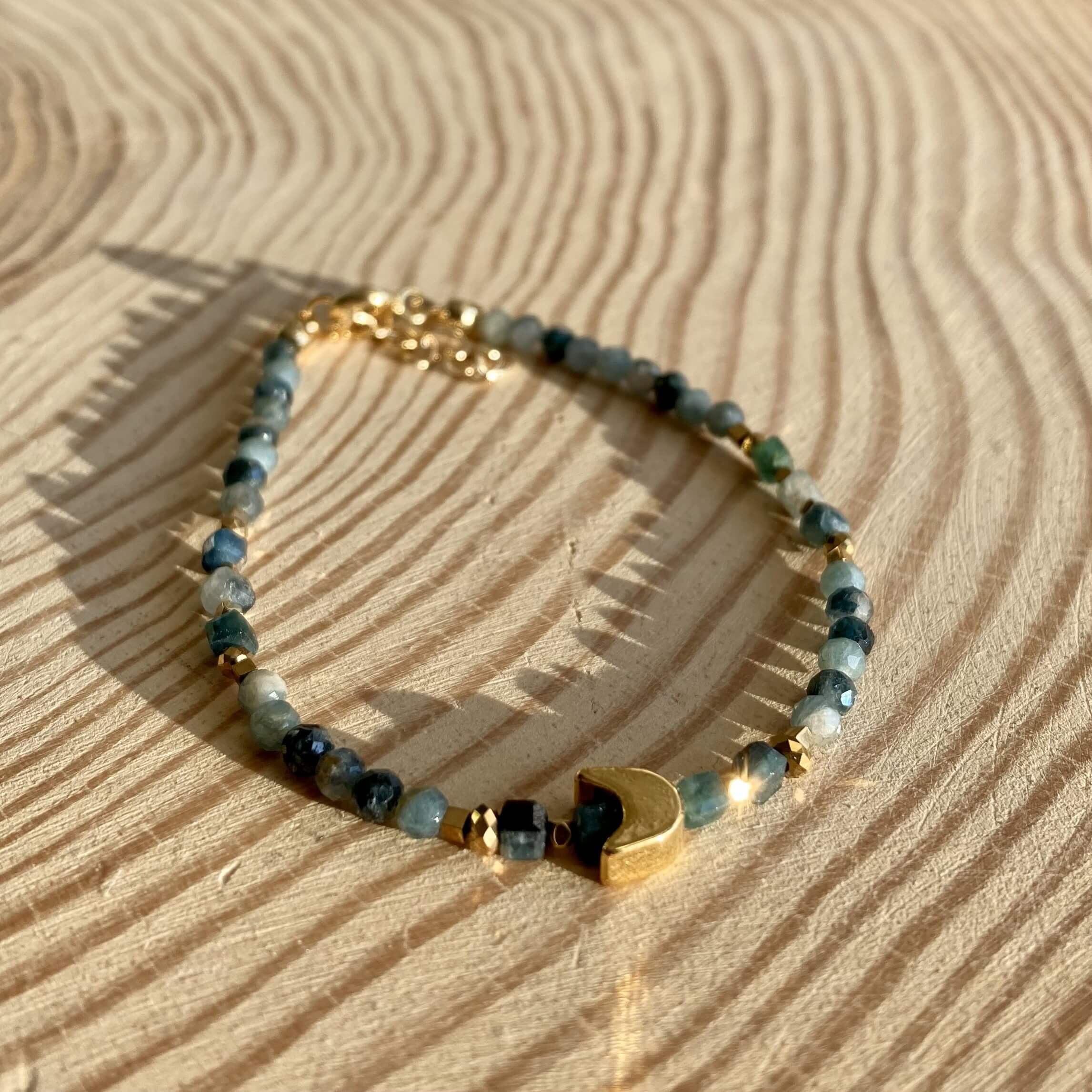 Bransoletka jest ręcznie robiona, powstała w pojedynczym, unikatowym egzemplarzu. Wykonana z naturalnego kamienia, niebieskiego turmalinu. Kamienie są fasetowane, co znaczy, że mają specjalny szlif dzięki, któremu pięknie odbijają światło. Bransoletka daje świetlisty i migoczący efekt.