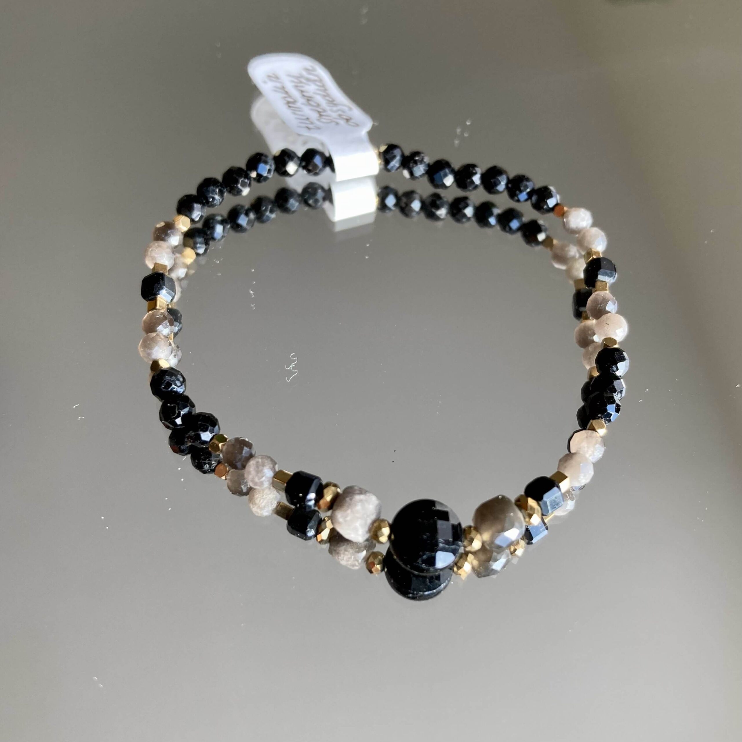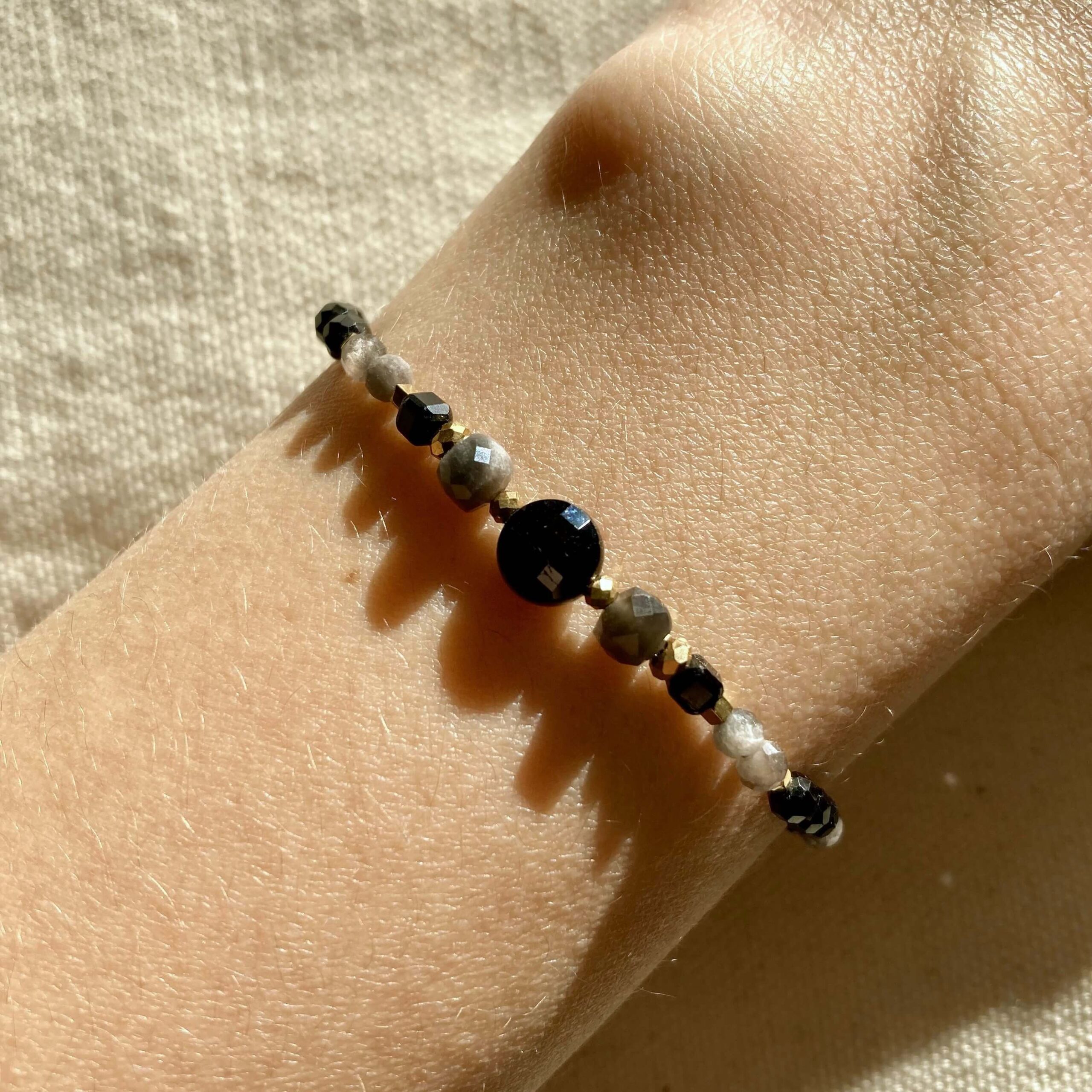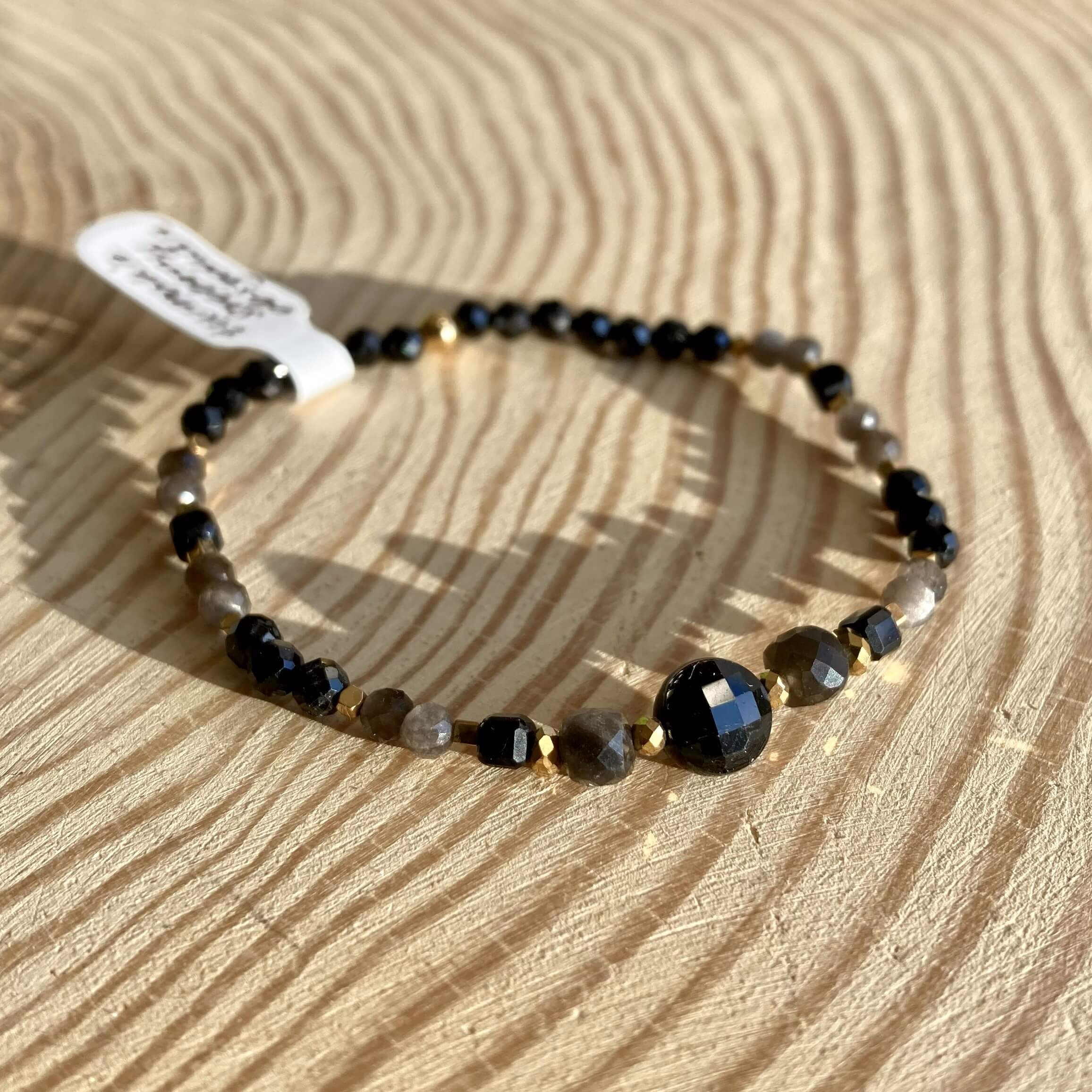 Bransoletka jest ręcznie robiona, powstała w pojedynczym, unikatowym egzemplarzu. Wykonana z naturalnych kamieni, czarnego turmalinu oraz srebrnego i złotego obsydianu. Srebrny obsydian wyróżnia się zjawiskiem występującej w nim opalizacji, co znaczy, że połyskuje srebrzyście w świetle. Kamienie są fasetowane, co znaczy, że mają specjalny szlif dzięki, któremu pięknie odbijają światło. Bransoletka daje świetlisty i migoczący efekt.