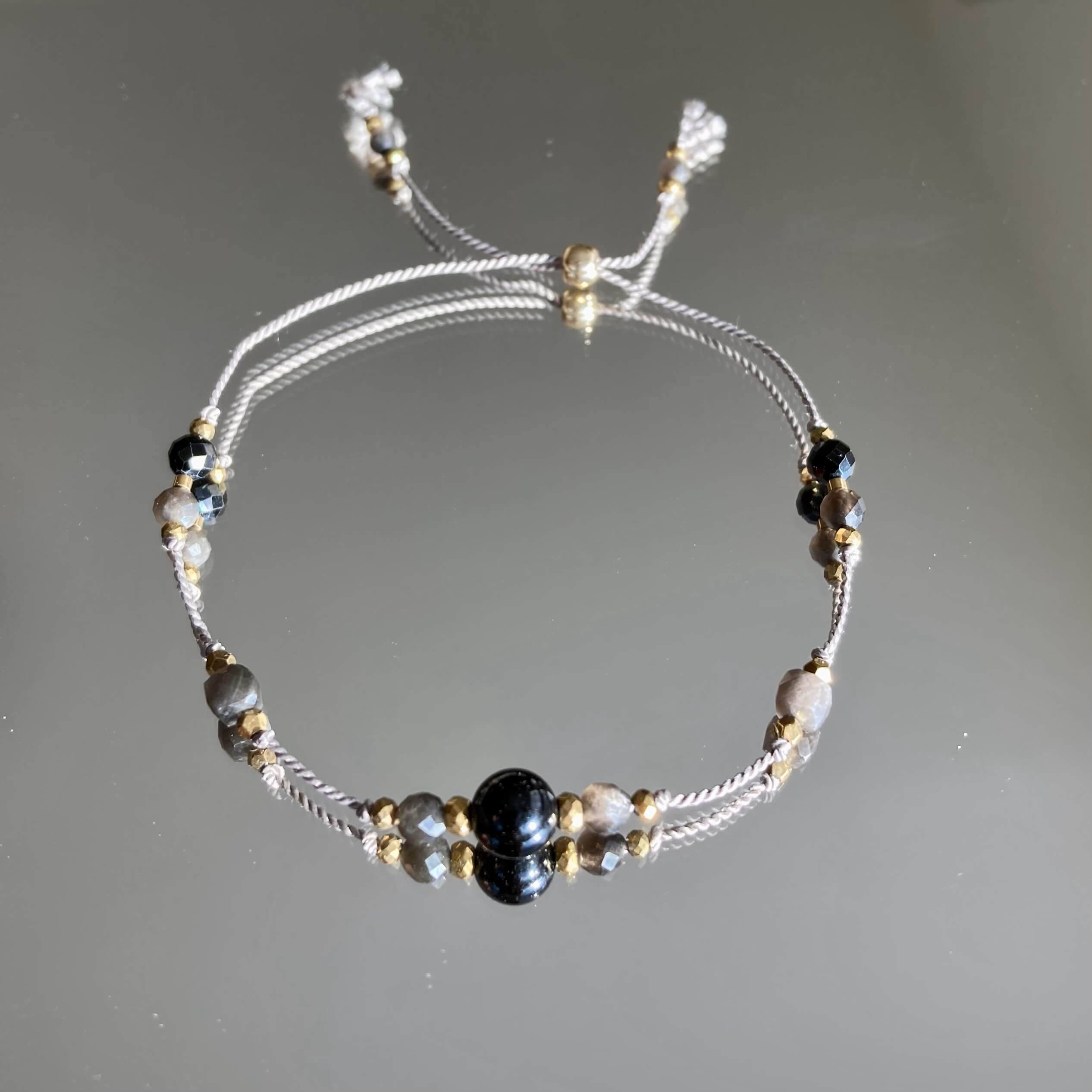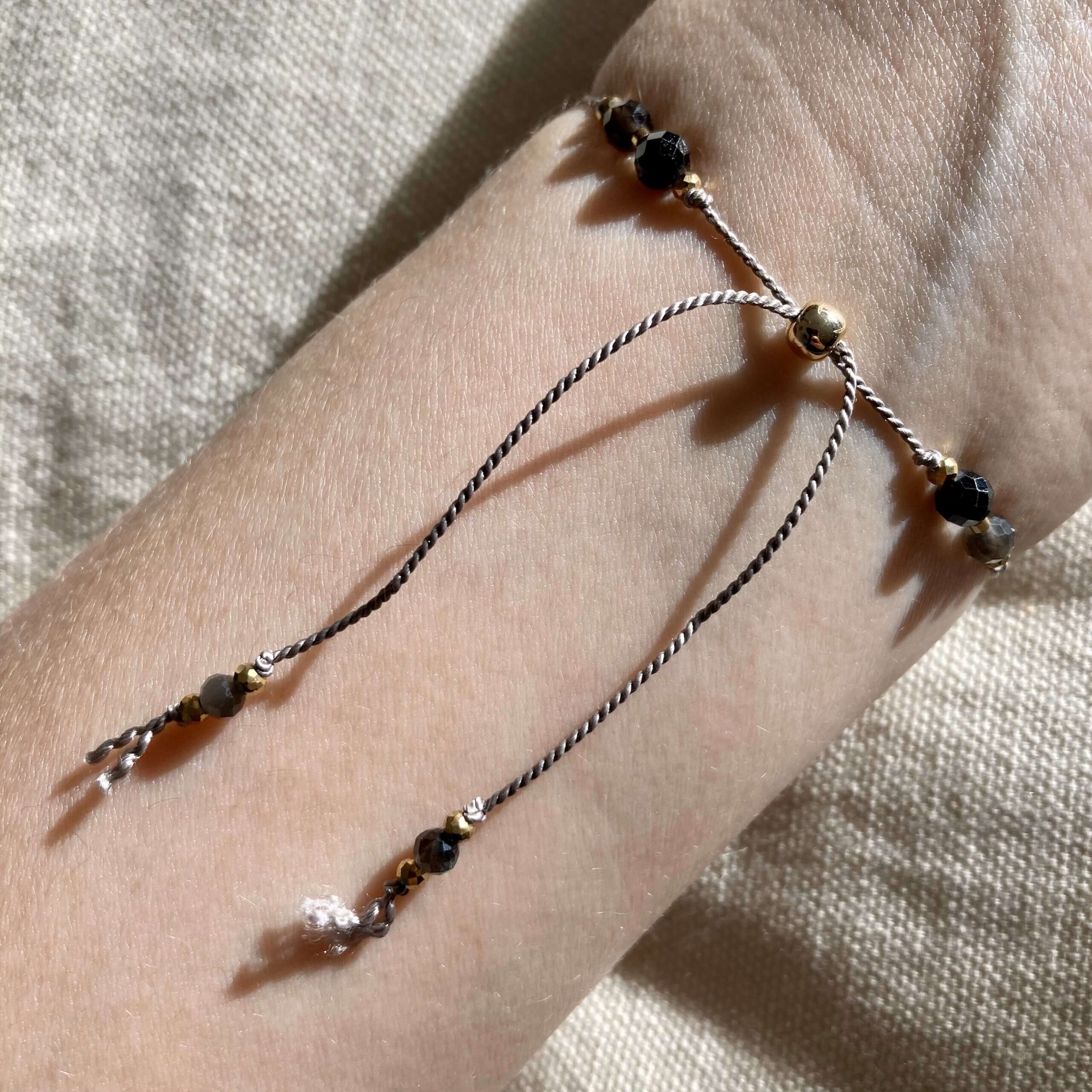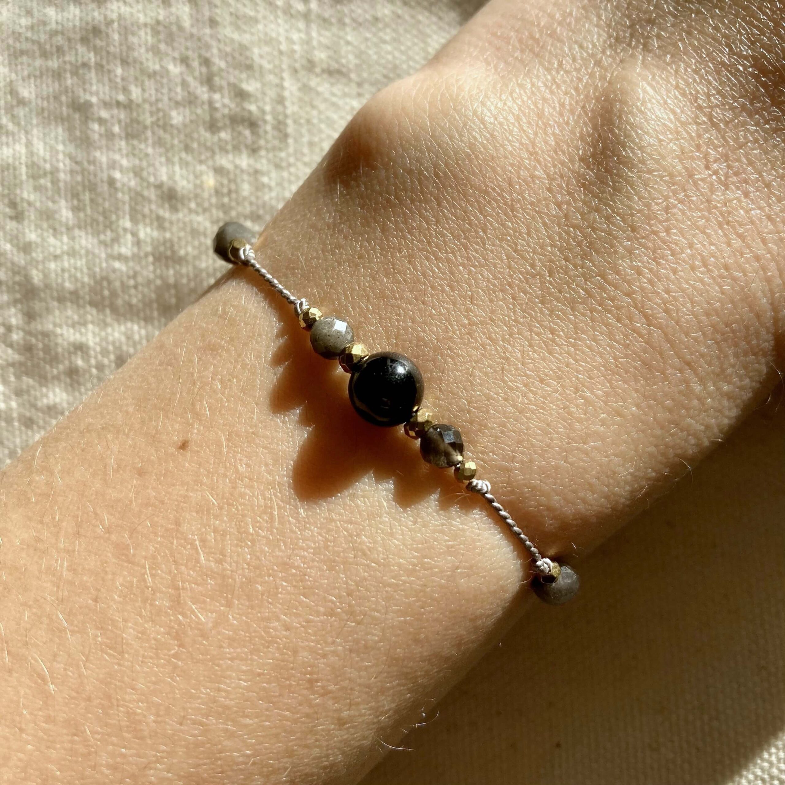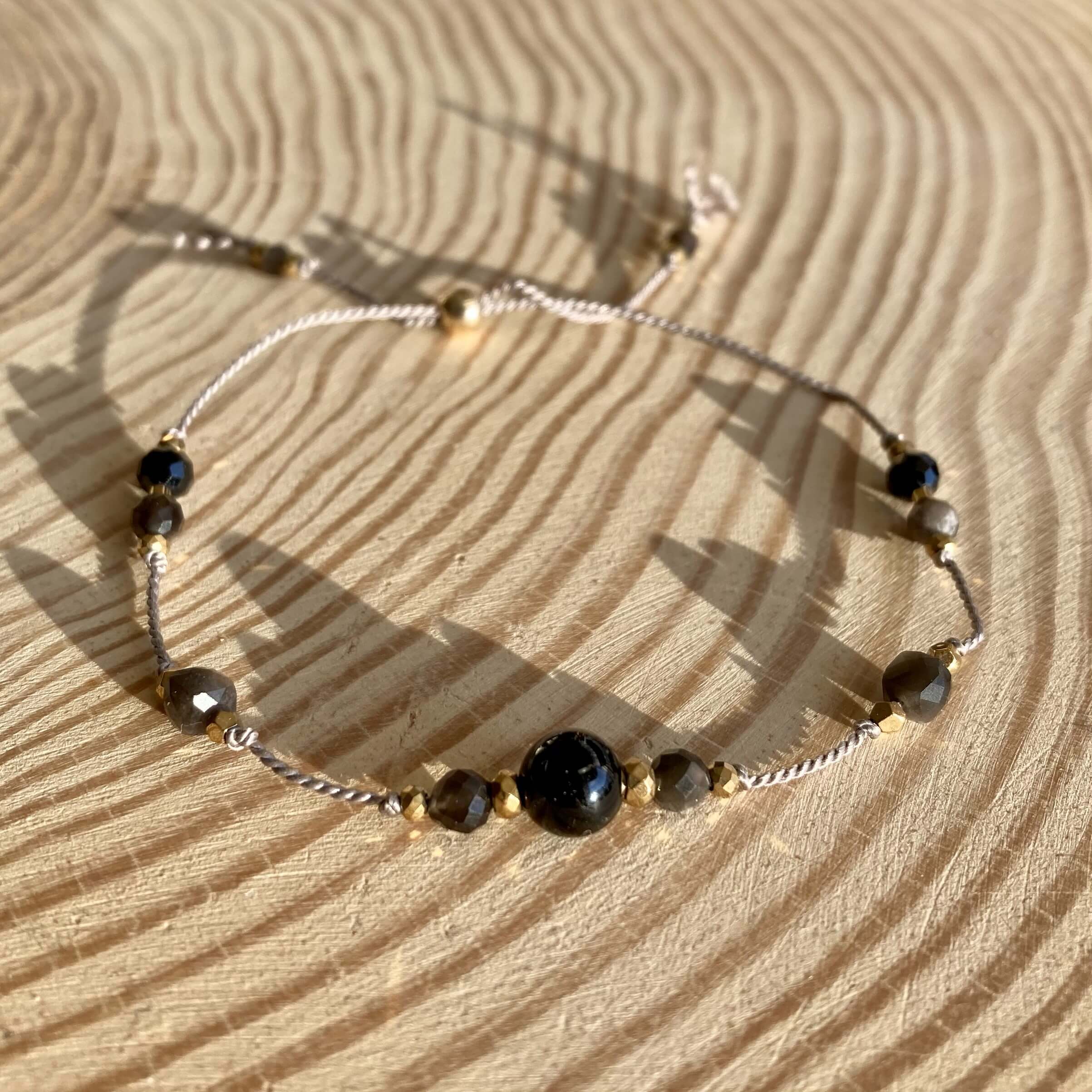 Bransoletka jest ręcznie robiona, powstała w pojedynczym, unikatowym egzemplarzu. Wykonana z naturalnych kamieni, czarnego turmalinu oraz srebrnego i złotego obsydianu. Srebrny obsydian wyróżnia się zjawiskiem występującej w nim opalizacji, co znaczy, że połyskuje srebrzyście w świetle. Kamienie są fasetowane, co znaczy, że mają specjalny szlif dzięki, któremu pięknie odbijają światło. Bransoletka daje świetlisty i migoczący efekt.