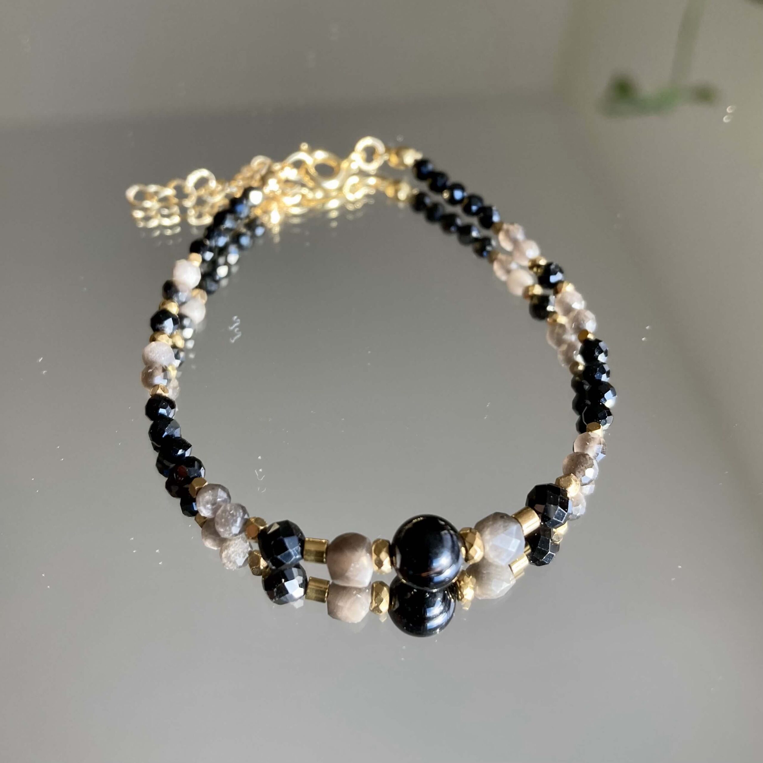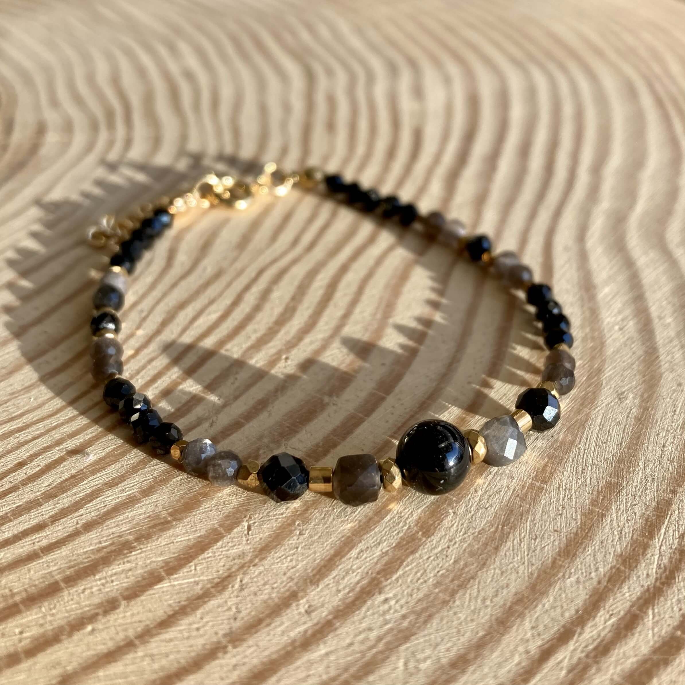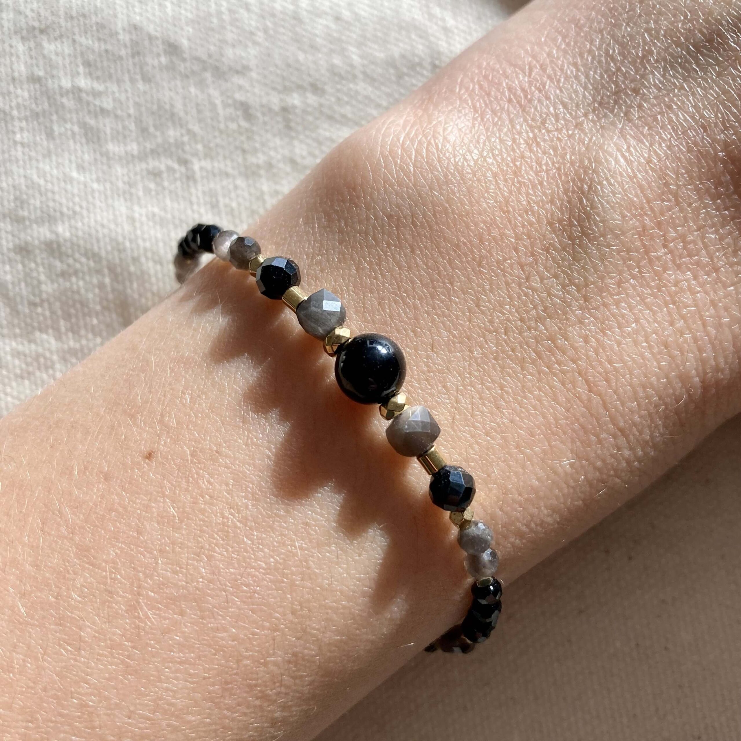 Bransoletka jest ręcznie robiona, powstała w pojedynczym, unikatowym egzemplarzu. Wykonana z naturalnych kamieni, czarnego turmalinu oraz srebrnego obsydianu. Srebrny obsydian wyróżnia się zjawiskiem występującej w nim opalizacji, co znaczy, że połyskuje srebrzyście w świetle. Kamienie są fasetowane, co znaczy, że mają specjalny szlif dzięki, któremu pięknie odbijają światło. Bransoletka daje świetlisty i migoczący efekt.