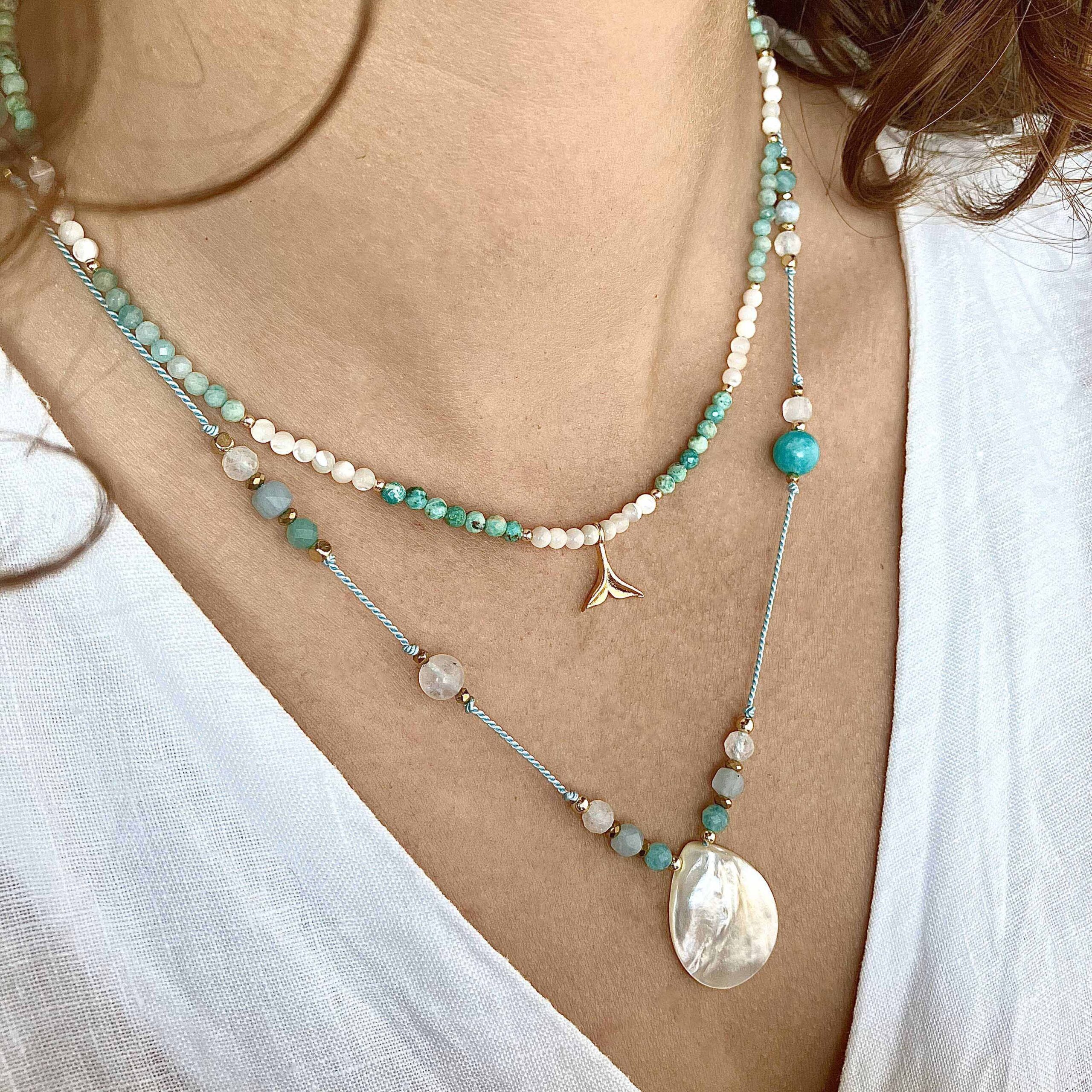 Na ostatnich dwóch zdjęciach propozycja kaskadowego połączenia z regulowanym, jedwabnym naszyjnikiem Ditya i bransoletką Asmi, dostępne na stronie do osobnego zakupu.