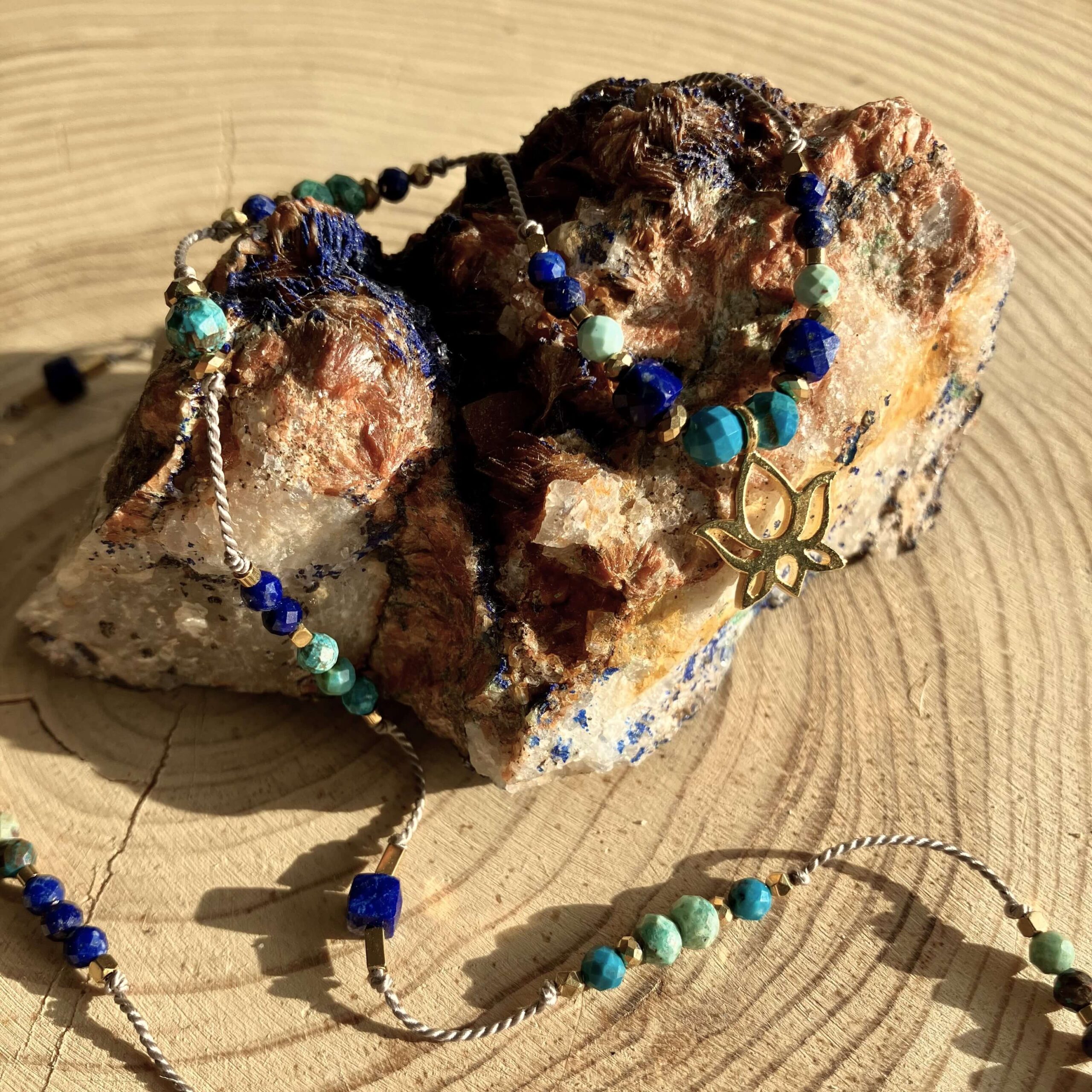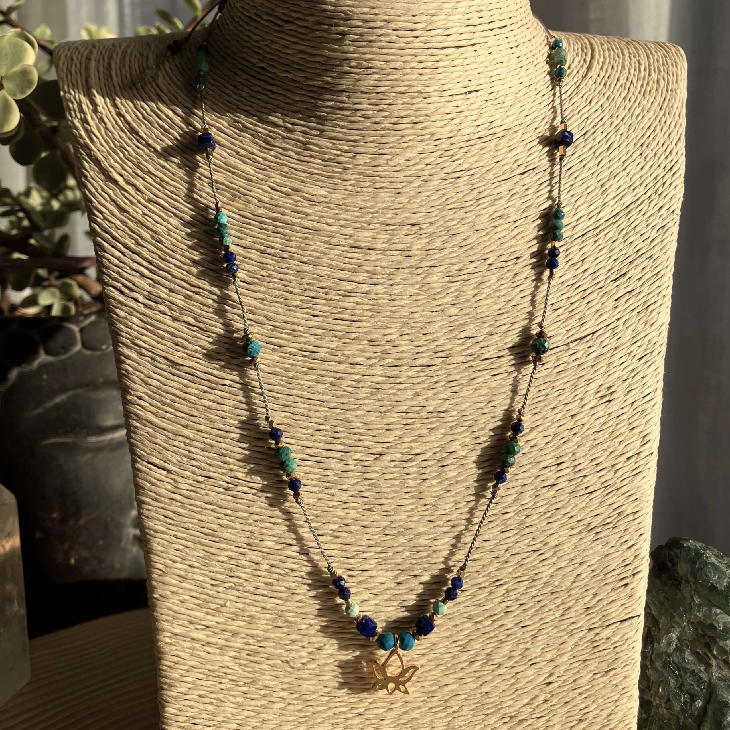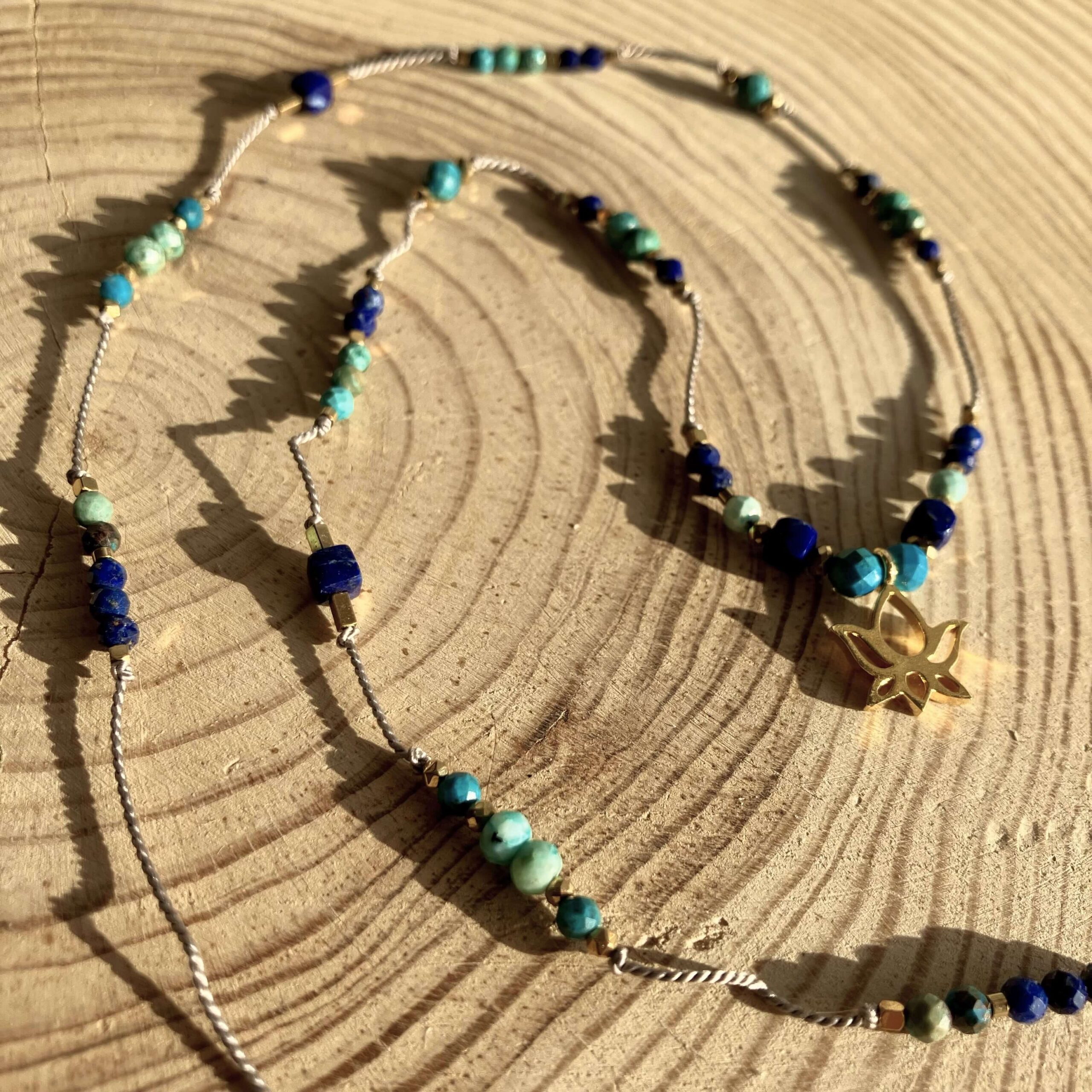 Naszyjnik jest ręcznie robiony, powstał w pojedynczym, unikatowym egzemplarzu. Wykonany z naturalnych kamieni, turkusu, lapis lazuli i chryzokoli. Kamienie są fasetowane, co znaczy, że mają specjalny szlif dzięki, któremu pięknie odbijają światło. Naszyjnik daje świetlisty i migoczący efekt.