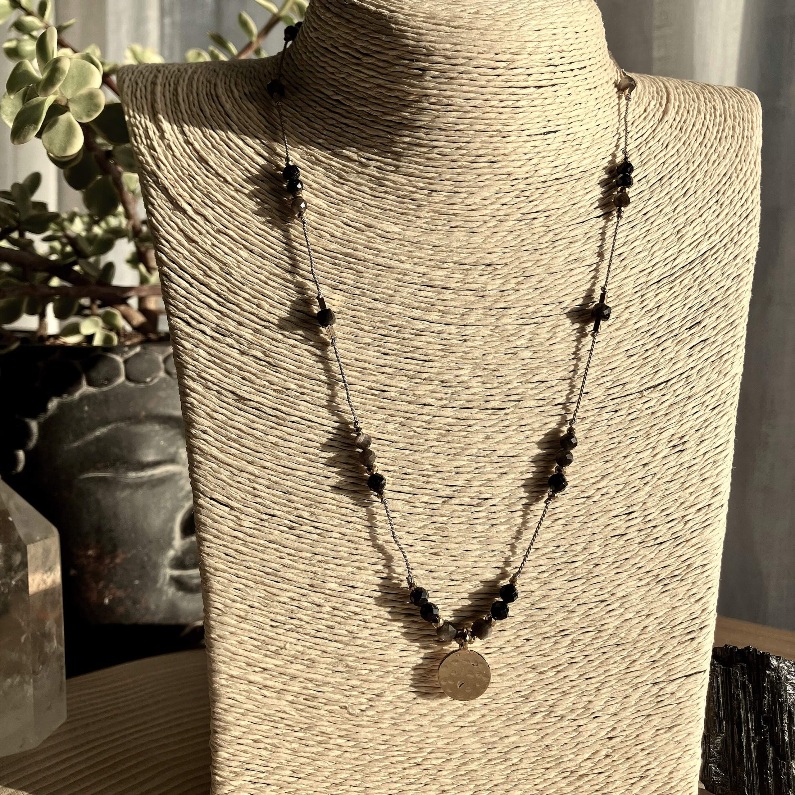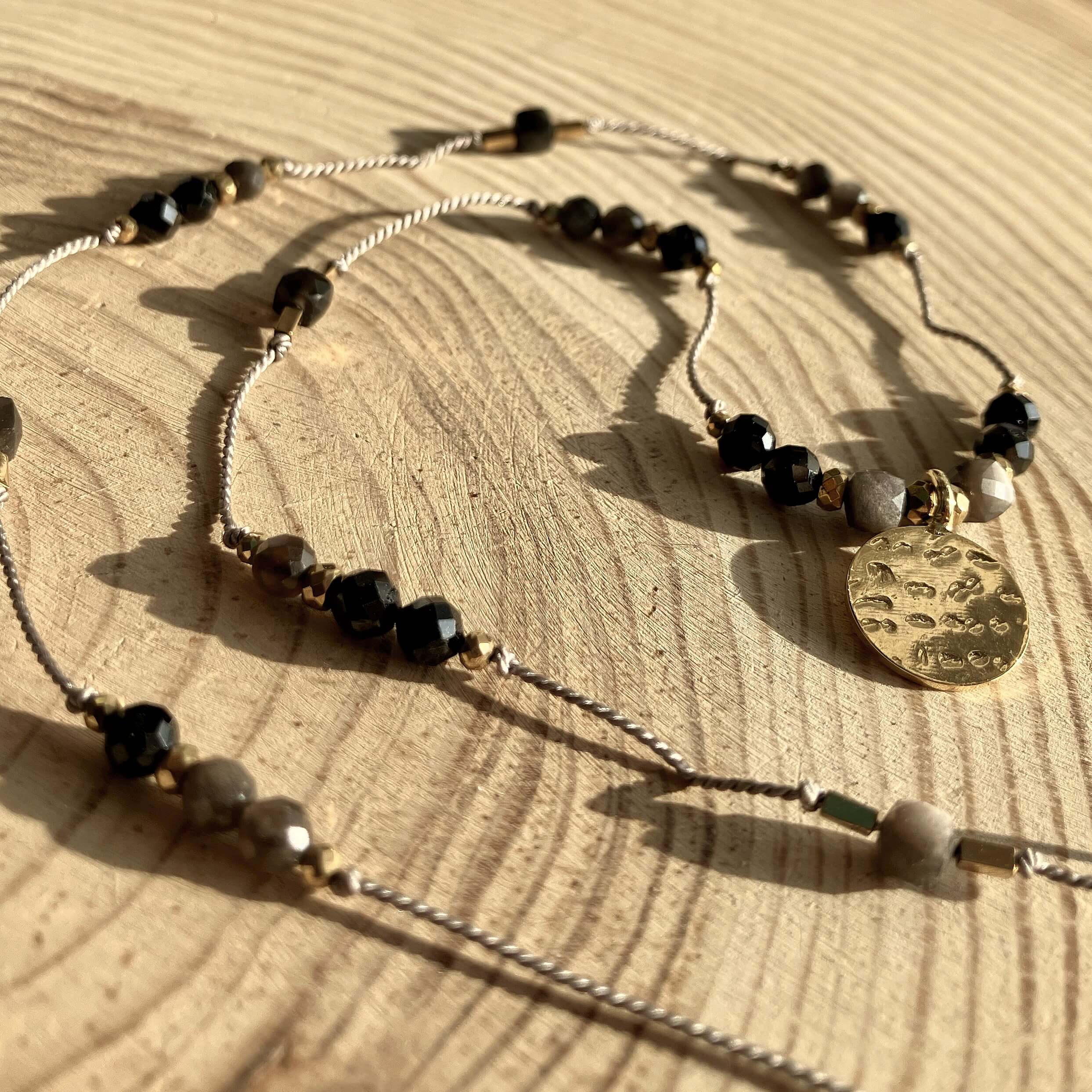 Rdzeniem naszyjnika jest nylonowa nić. Między kamieniami znajdują się przekładki z pozłacanego hematytu. Pozostałe pozłacane elementy są wykonane z mosiądzu. Mosiądz jest hipoalergicznym i bezpiecznym stopem minerałów cynku oraz miedzi. Jako alternatywa dla złota, przy odpowiedniej pielęgnacji może zachować swój złoty kolor i zachwycać swoim blaskiem bez końca.