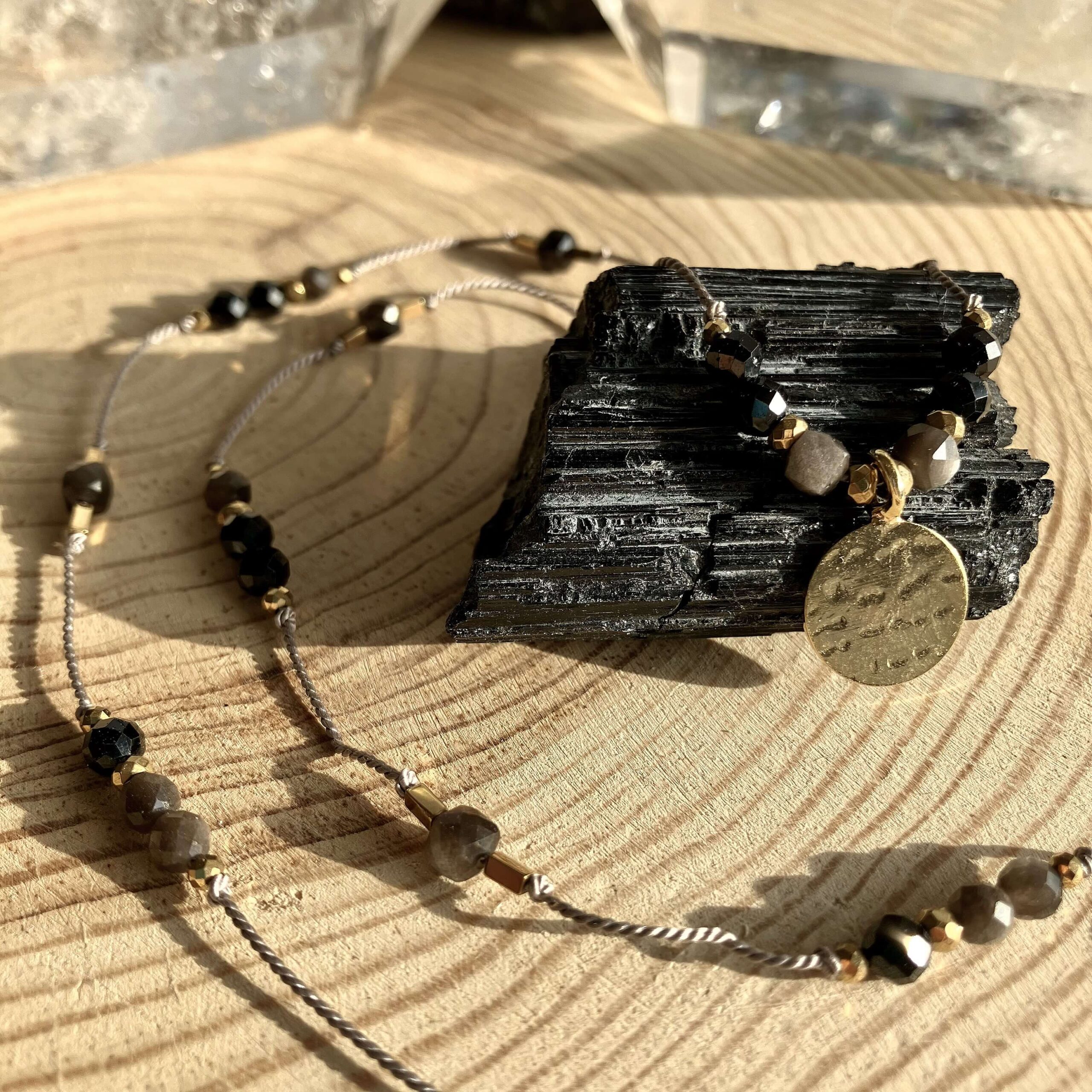 Naszyjnik jest ręcznie robiony, powstał w pojedynczym, unikatowym egzemplarzu. Wykonany z naturalnych kamieni, czarnego turmalinu oraz srebrnego obsydianu. Srebrny obsydian wyróżnia się zjawiskiem występującej w nim opalizacji, co znaczy, że połyskuje srebrzyście w świetle. Kamienie są fasetowane, co znaczy, że mają specjalny szlif dzięki, któremu pięknie odbijają światło. Naszyjnik daje świetlisty i migoczący efekt.